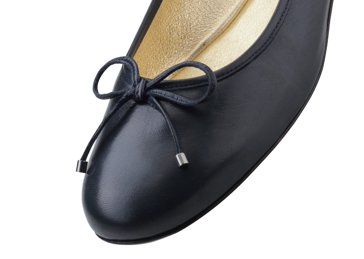 Diese zeitlosen Ballerinas sind nicht nur fürs Office. Das Paar besteht aus blauem handschuhweichem Nappaleder und besticht durch seine klassische Silhouette und die runde Zehenspitze. Abgerundet wird das Paar durch eine filigrane Schleife, die an ihren Enden verziert sind. Gefertigt wurde das Paar in aufwendiger Handarbeit in der Nähe von Florenz. Dank der flexiblen Ledersohle und des weichen Leder - Fußbetts garantiert dieser Ballerina höchsten Komfort über den ganzen Tag.